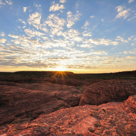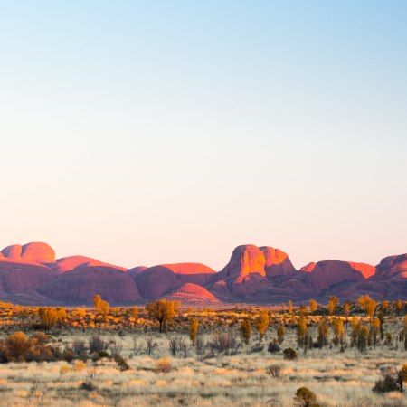 Alice Springs Vers UluruAlice Springs - UluruEn quittant Alice Springs et en traversant des paysages isolés de l'outback, à notre arrivée à Yulara, nous visitons d'abord les dômes imposants de Kata Tjuta, ce qui signifie "nombreuses têtes". En marchant le long du sentier rocheux de Walpa Gorge, rafraîchi par la brise à travers la gorge, nous gardons un œil sur les plantes rares et les arbres de spearwood. Ensuite, nous nous installons dans nos chambres à l'hôtel Desert Garden, notre maison pour deux nuits. Le soir, nous nous rassemblons à un point de vue en face d'Uluru, le plus grand monolithe au monde. Quand le soleil se couche, cette montagne sacrée pour les Aborigènes se transforme en un mur lumineux de couleurs, d'abord doré puis d'un rouge profond. Et nous regardons, un verre de vin pétillant à la main. Dès qu'il fait nuit, nous retournons à l'hôtel.